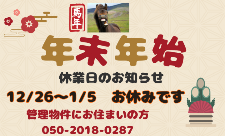 2025年も残すところあとわずかとなりました。 入居者様、オーナー様、取引業者様におかれましてはますますご清栄のこととお慶び申し上げます。 本年は格別のご愛顧を賜り、まことに有難く厚く御礼申し上げます。 さて、弊社では 令和7年12月26日~令和8年1月5日迄年末年始休暇とさせて頂きます。 令和8年1月6日から通常営業となります。 弊社管理物件にお住いのご入居様、緊急の場合は誠にお手数をお掛け致しますが、 「050-2018-0287」までご連絡をお願い致します。